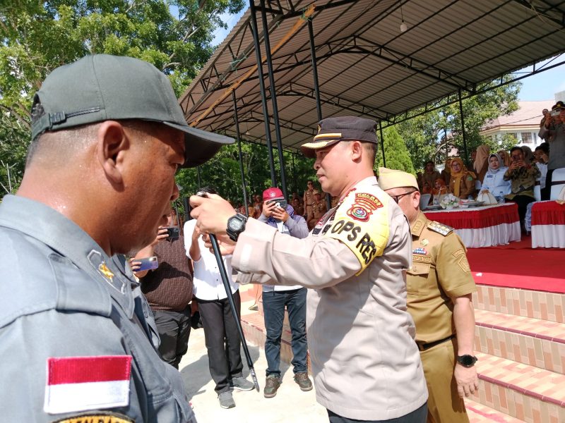 Kapolres Konawe AKBP Ahmad Setiadi, S.I.K saat menyerahkan seragam kepada perwakilan Linmas yang akan bertugas pada Pemilu 2024.