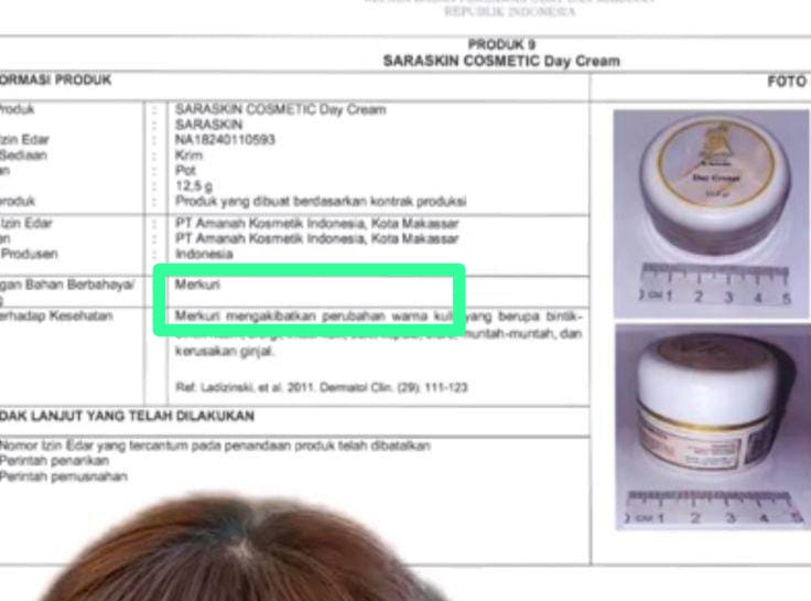“Ada Bogota, Maxie, dan kemudian ada krm yang mengandung merkuri semua nih yang paling bawah, ada namanya Saraskin Cosmetic F & A Glow, Helena Lizer, Mantulita Merkurinya Hmm, Fly Glow, dan FF Virvin Glowing, hmm itu juga, udah lama banget kan, kenna lagi gitu yaa,”tegasnya.