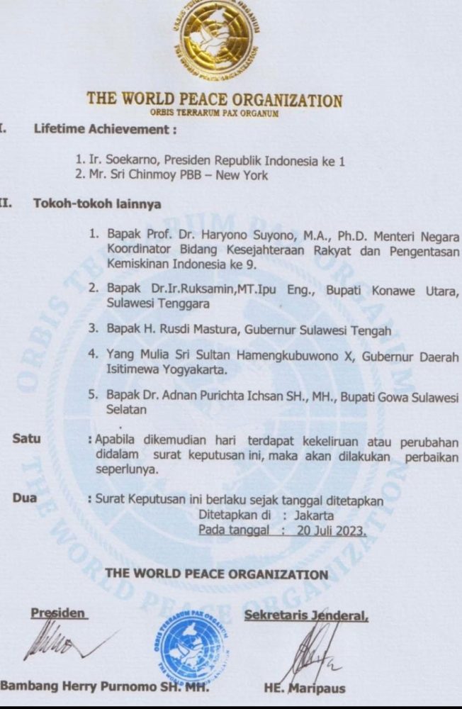 WPO memberikan anugerah “World Peace Award” kepada beberapa tokoh nasional dan internasional. Salah satunya, Bupati Konawe Utara Ruksamin yang menerima penghargaan World Peace Award 2023 kategori “Chief Achievement”.