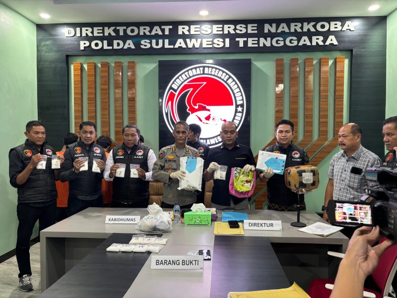 Dalam konferensi pers kali ini, Ditresnarkoba Polda Sultra menangkap tiga orang tersangka tindak pidana penyalahgunaan narkotika jenis shabu serta temuan barang bukti ganja tak bertuan salah alamat.
