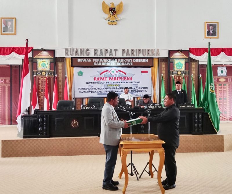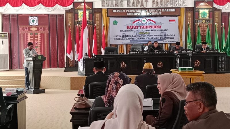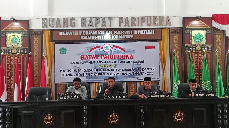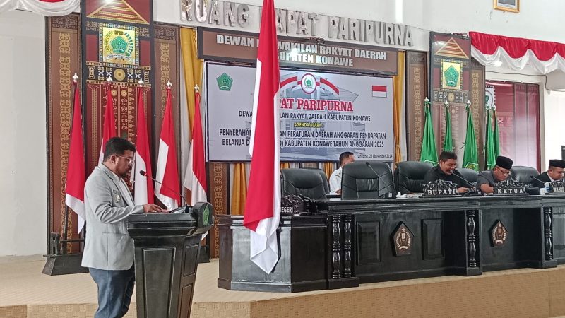 Muarasultra.com, KONAWE – Dewan Perwakilan Rakyat Daerah atau DPRD Kabupaten Konawe menggelar rapat paripurna penyerahan rancangan peraturan daerah (Raperda) anggaran pendapatan belanja daerah (APBD) Kabupaten Konawe tahun anggaran 2025.