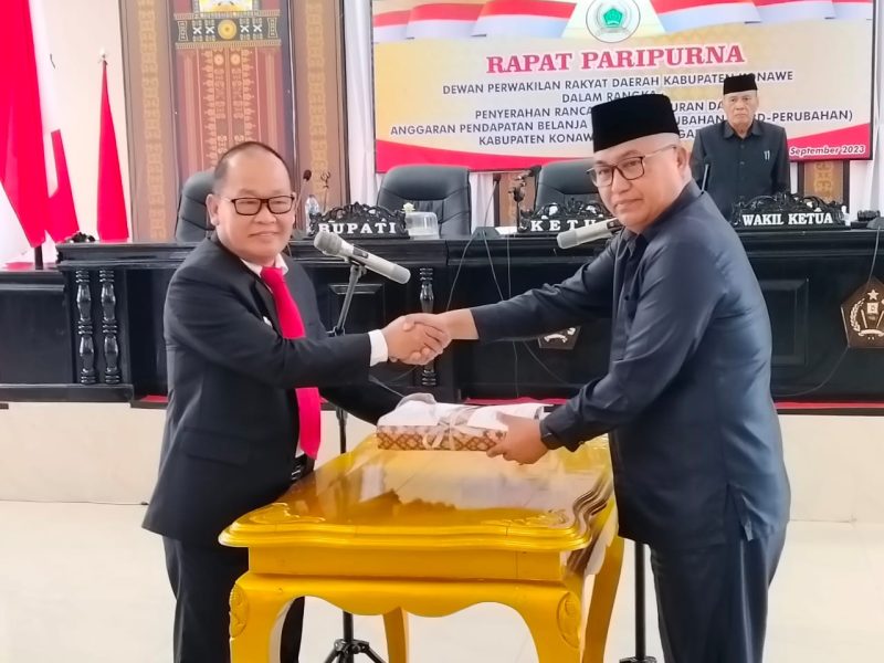Muarasultra.com, KONAWE – Dewan Perwakilan Rakyat Daerah (DPRD) Kabupaten Konawe menggelar rapat paripurna penyerahan rancangan peraturan daerah (Raperda) Anggaran pendapatan belanja daerah (APBD-Perubahan) bersama PJ Bupati Konawe Harmin Ramba, Unsur Forkopimda dan pimpinan OPD Kabupaten Konawe, Selasa (26/9/2023).
