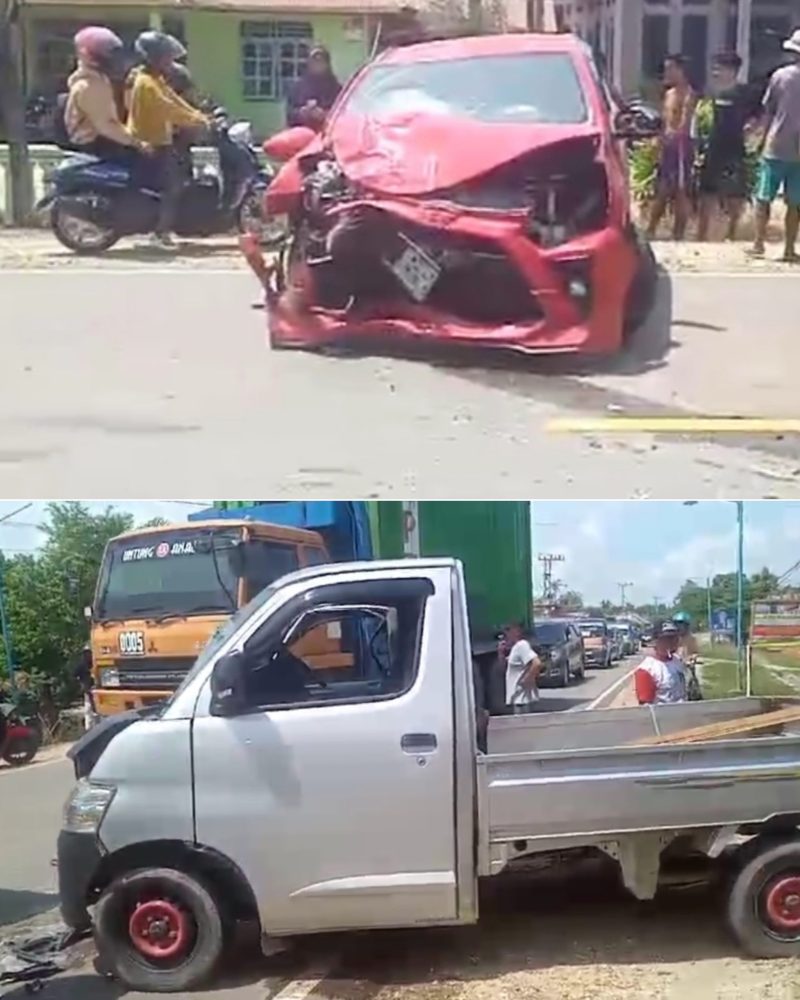Kali ini sebuah minibus DT 3887 XF bertabrakan dengan mobil pick up putih DT 8768 HE. Akibat peristiwa kecelakaan tersebut kedua kendaraan remuk dan mengalami rusak berat akibat tabrakan keras.