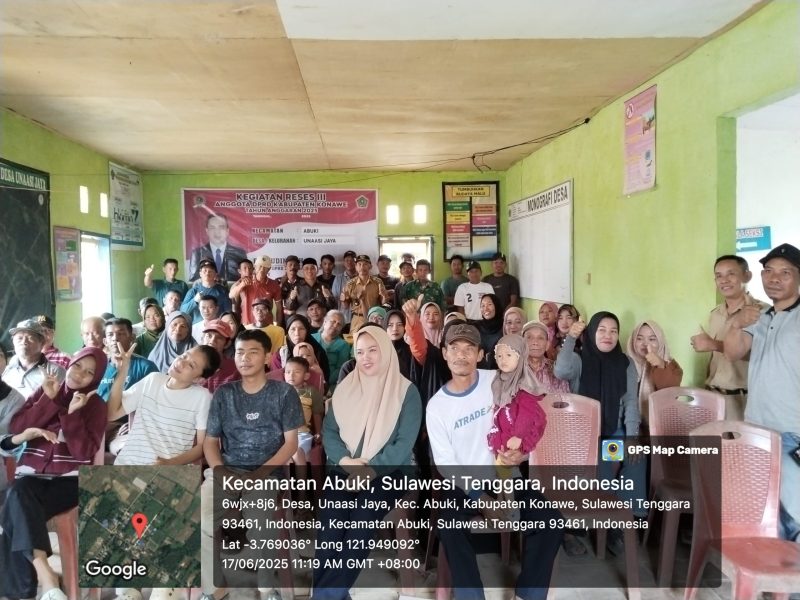 Muarasultra.com, KONAWE – Anggota Dewan Perwakilan Rakyat Daerah (DPRD) Kabupaten Konawe, Fakruddin, S.Hut melaksanakan reses di desa Unaasi Jaya, Kecamatan Abuki, Kabupaten Konawe, Sulawesi Tenggara, Selasa (17/6/2025).