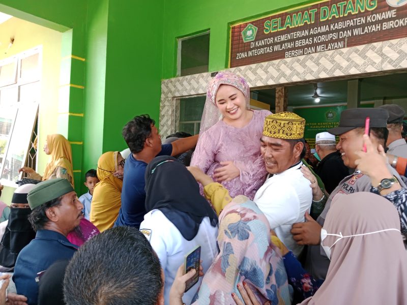 Pemerintah Daerah Kabupaten Konawe bersama Forum Komunikasi Pimpinan Daerah (Forkopimda) menjemput 134 jamaah haji asal Kabupaten Konawe di halaman kantor Kemenag Konawe.