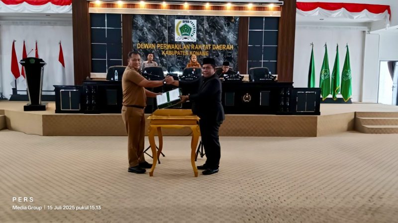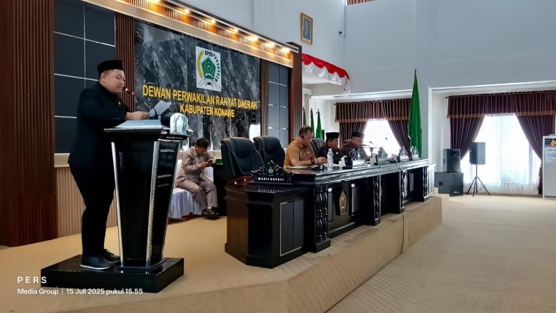 Muarasultra.com, KONAWE – Dewan Perwakilan Rakyat Daerah (DPRD) Kabupaten Konawe, Provinsi Sulawesi Tenggara, menggelar Rapat Paripurna Penyerahan Dokumen Dua Rancangan Peraturan Daerah (Raperda) Tahun 2025 dari Pemerintah Daerah kepada DPRD Konawe, pada Selasa, 15 Juli 2025.