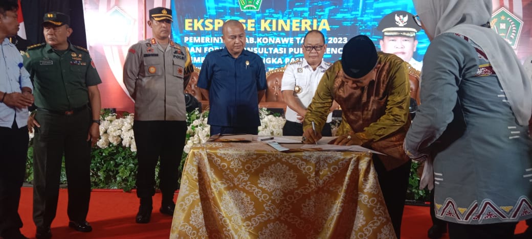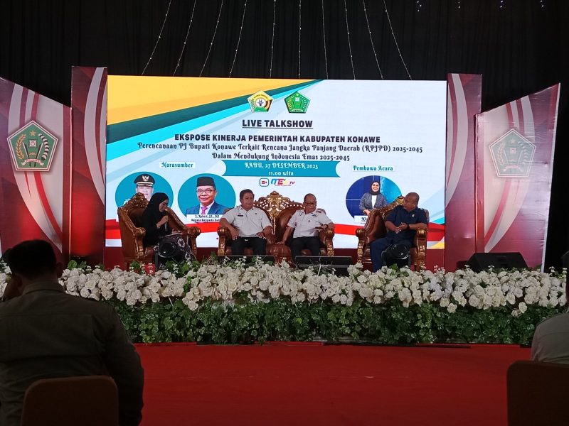 Ekspos kinerja pembangunan daerah oleh PJ Bupati Konawe bertajuk ” Mari Wujudkan Kabupaten Konawe Maju, Mandiri Dan Berkelanjutan Menuju Indonesia Emas 2045″, dihadiri oleh Kapolres Konawe , Pabung Konawe, Ketua KPU Konawe, Sekda Konawe, perwakilan Kepala Bappeda Provinsi, Forkopimda, pemerintah desa, praktisi, LSM, akademisi, hingga pegawai Aparatur Sipil Negara (ASN) wilayah setempat.