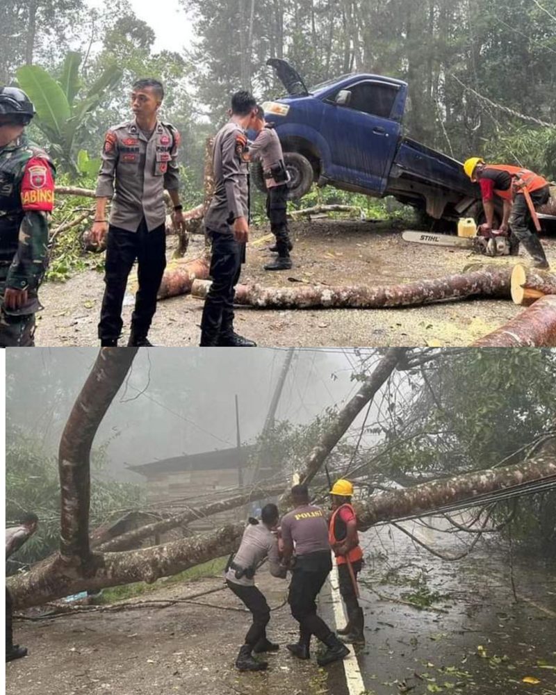 Lanjutnya, pohon tumbang tersebut juga menutup badan jalan hingga menyebabkan seluruh badan jalan di Puncak Simbune tertutup.