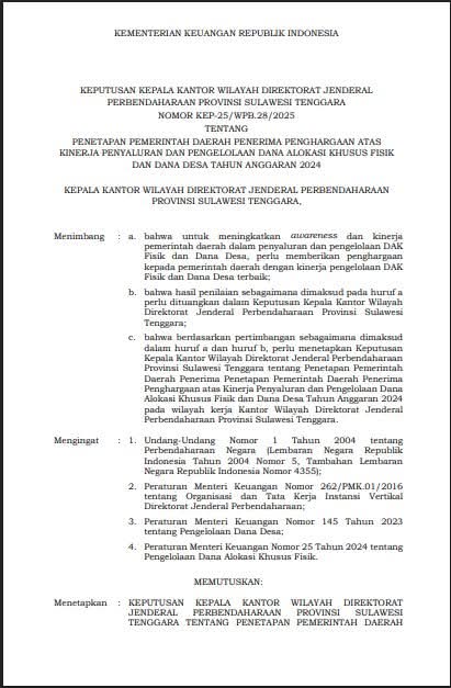 Muarasultra.com, Konawe – Pemerintah Kabupaten Konawe kembali menorehkan prestasi membanggakan di tingkat Sultra. Penghargaan ini diumumkan melalui surat keputusan kepala kantor wilayah direktorat jenderal perbendaharaan provinsi sulawesi tenggara nomor kep-25/wpb.28/2025 tentang penetapan pemerintah daerah penerima penghargaan atas kinerja penyaluran dan pengelolaan dana alokasi khusus fisik dan dana desa tahun anggaran 2024.