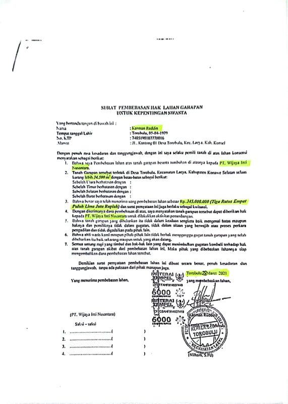 Muarasultra.com, KONAWE SELATAN – Kepala desa Torobulu Ilham S.Pd diduga menjual tanah negara kepada pihak swasta dalam hal ini PT Wijaya Inti Nusantara.