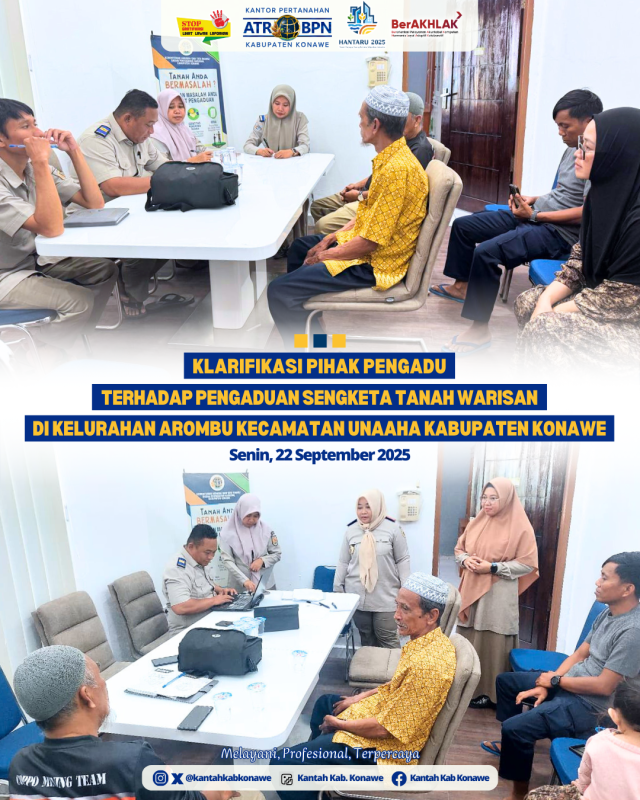 Muarasultra.com, KONAWE – Kantor pertanahan (Kantah) Kabupaten Konawe, melalui Seksi Pengendalian dan Penanganan Sengketa, mengundang pihak Pengadu untuk melakukan klarifikasi atas pengaduan yang diajukan dengan Nomor: 174/P/IX/2025, tanggal 17 September 2025, terkait sengketa tanah warisan yang berlokasi di Kelurahan Arombu, Kecamatan Unaaha, Kabupaten Konawe.