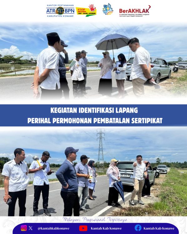 Muarasultra.com, KONAWE — Seksi Pengendalian dan Penanganan Sengketa bersama Seksi Survei dan Pemetaan Kantor Pertanahan Kabupaten Konawe melaksanakan kegiatan identifikasi lapangan terkait pengaduan Permohonan Pembatalan Sertipikat yang berlokasi di Kelurahan Inalahi, Kecamatan Wawotobi, Kabupaten Konawe.