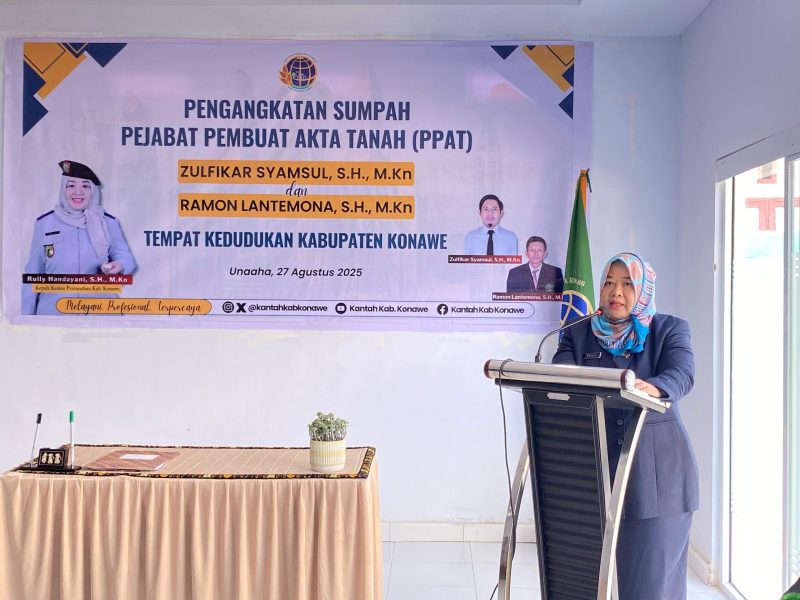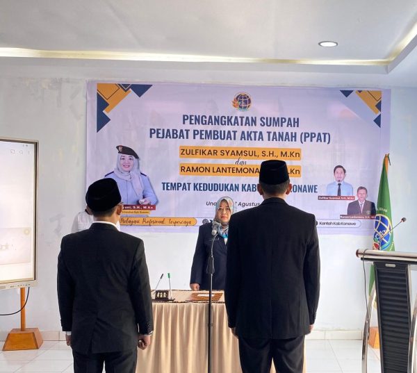 Muarasultra.com, KONAWE – Kantor Pertanahan Kabupaten Konawe resmi melaksanakan kegiatan Pengangkatan Sumpah Pejabat Pembuat Akta Tanah (PPAT) atas nama Zulfikar Syamsul, S.H., M.Kn dan Ramon Lantemona, S.H., M.Kn, yang akan bertugas di wilayah Kabupaten Konawe.