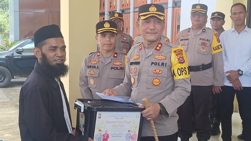 Bertempat di Lobi teras Mako Polres Konawe Utara Kapolres Konawe utara AKBP Priyo Utomo, S.H., S.I.K menyerahkan bingkisan lebaran idul fitri 2024 kepada para santri Pesantren Hidayatullah yang beralamat di Desa Lamondowo Kecamatan Andowia, Rabu (17/4/24).