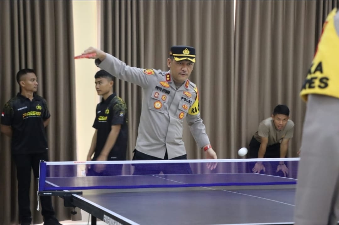 Pertandingan eksibisi turnamen tenis meja Hut ke-4 Polres Konut antara Bapak Kapolres AKBP Priyo Utomo, S.H., S.I.K berhadapan Wakapolres Konawe Utara Kompol Urva Lomansyah, S.Si., S.I.K., M.H
