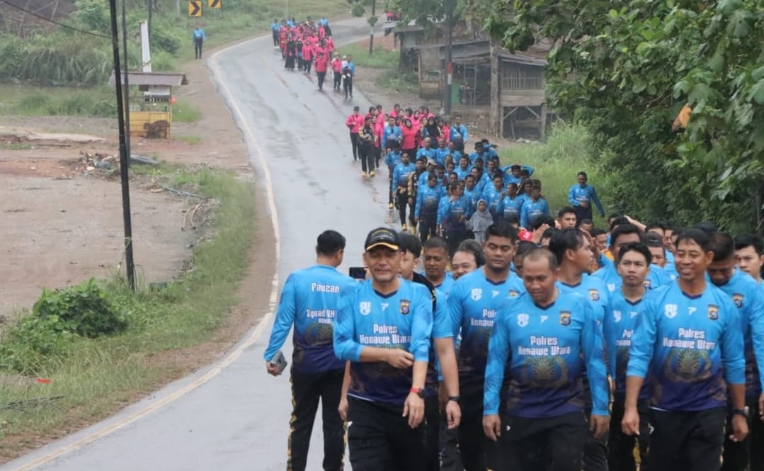 Giat jalan sehat yang dilepas Kapolres dari kantor Polres selanjutnya berjalan mengintari Perkantoran Pemda Konut kemudian kembali kembali ke Polres untuk melaksanakan senam zumba bersama personil dan Bhayangkari.