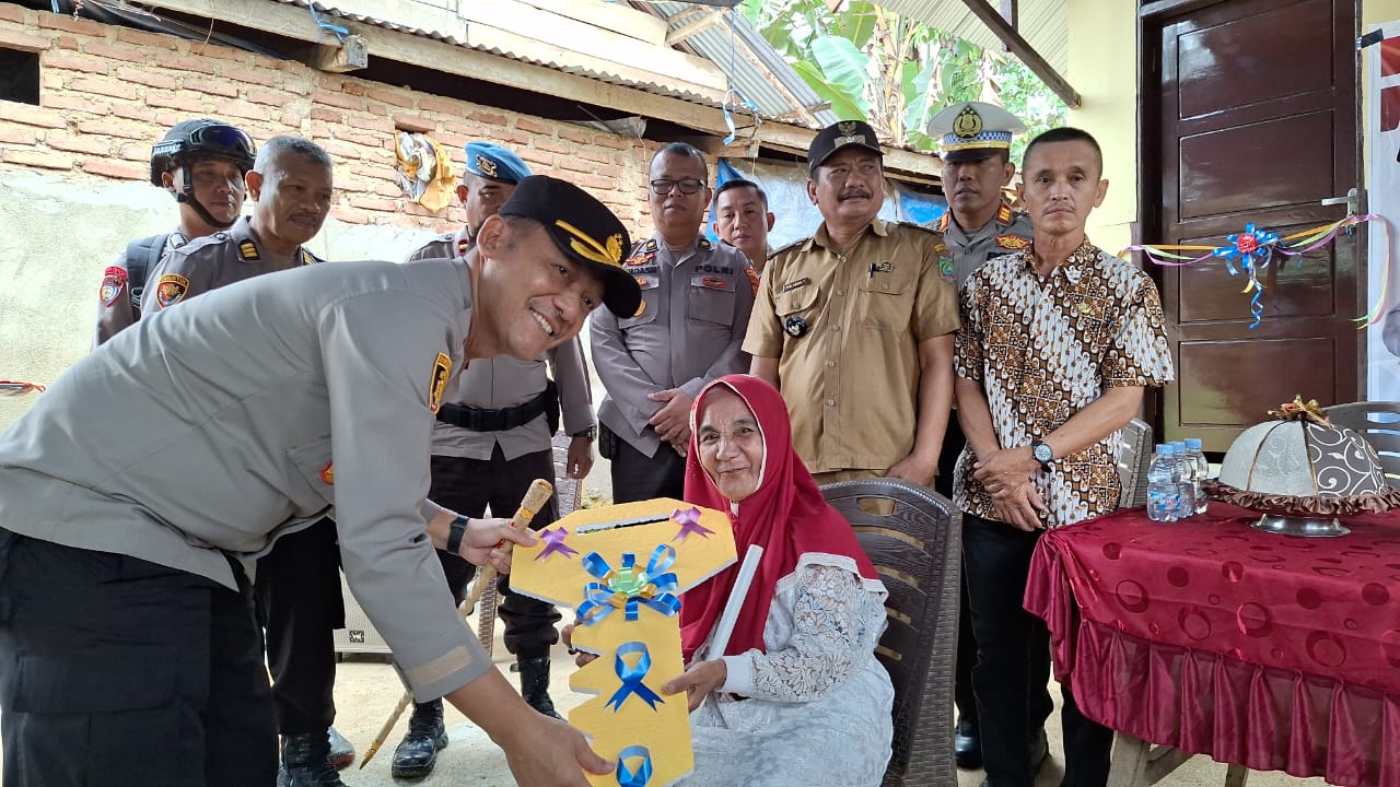 Usai memberikan sambutannya, AKBP Priyo Utomo kemudian menyerahkan secara simbolis kunci rumah kepada Ibu Sogara dan mengunting pita sebagai tanda resminya penyerahan dan pemakaian rumah layak huni tersebut.