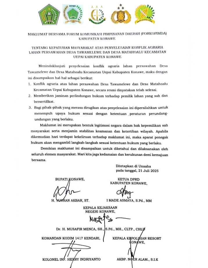 Muarasultra.com, KONAWE — Forum Komunikasi Pimpinan Daerah (Forkopimda) Kabupaten Konawe resmi mengeluarkan maklumat bersama terkait penyelesaian konflik agraria lahan persawahan antara masyarakat Desa Tawamelewe dan Desa Matahoalu, Kecamatan Uepai, Kabupaten Konawe.