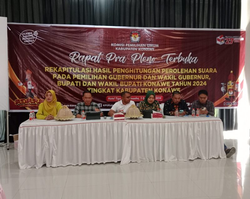 Muarasultra.com, KONAWE – Komisi Pemilihan Umum (KPU) Kabupaten Konawe, Sulawesi Tenggara, menggelar rapat pra pleno rekapitulasi hasil perhitungan dan perolehan suara pemilihan gubernur dan wakil gubernur Sulawesi Tenggara, bupati dan wakil bupati Konawe tahun 2024.