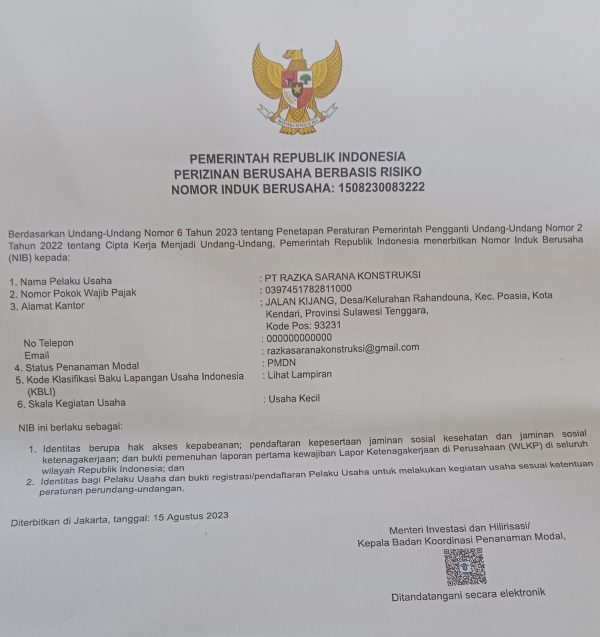 Berdasarkan hasil penelusuran investigatif Sistem OSS (Online Single Submission) dan penerbitan NIB (Nomor Induk Berusaha) yang berada di bawah pengelolaan Kementerian Investasi dan Hilirisasi/Badan Koordinasi Penanaman Modal (BKPM), diketahui PT Razka Sarana Konstruksi (RSK) tidak memiliki izin kegiatan di Kabupaten Konawe.