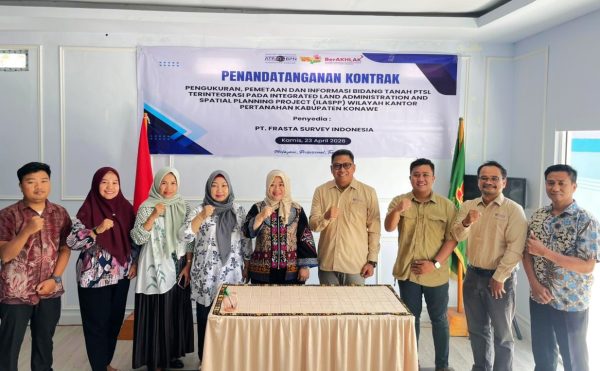 Muarasultra.com, KONAWE – Kepala Kantor Pertanahan Kabupaten Konawe, Rully Handayani, S.H., M.Kn., secara resmi menandatangani kontrak kerja sama dengan PT Frasta Survey Indonesia untuk melaksanakan pekerjaan pengukuran, pemetaan, dan penyediaan informasi bidang tanah Pendaftaran Tanah Sistematis Lengkap (PTSL) terintegrasi.