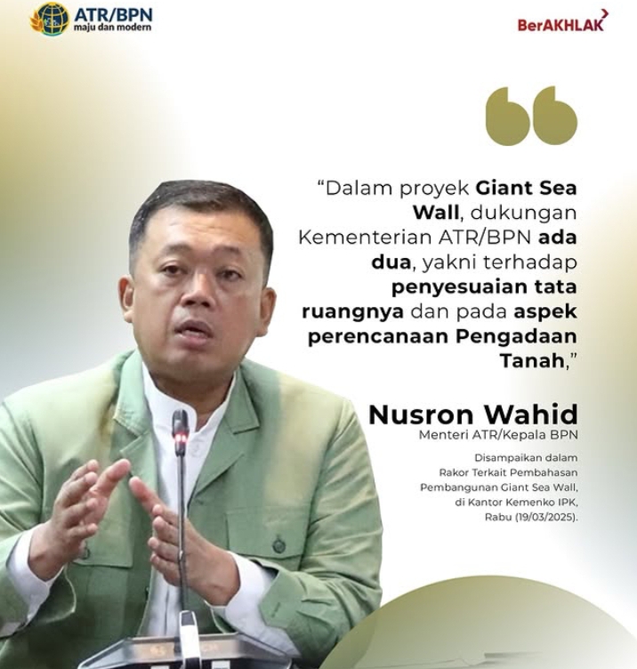 “Dalam proyek Giant Sea Wall, dukungan Kementerian ATR/BPN ada dua, yakni terhadap penyesuaian tata ruangnya dan pada aspek perencanaan Pengadaan Tanah,” kata Menteri Nusron dalam Rapat Koordinasi terkait Pembahasan Pembangunan Giant Sea Wall, di Kantor Kementerian Koordinator Bidang Infrastruktur dan Pembangunan Kewilayahan (Kemenko IPK), Rabu (19/03/2025).