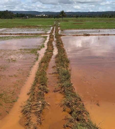 Puluhan Hektar Sawah di Desa Lamedai, Kecamatan Tanggetada, Kabupaten Kolaka terendam banjir akibat intensitas curah hujan yang sangat tinggi, sedimen lumpur setinggi betis menutupi area pesawahan.