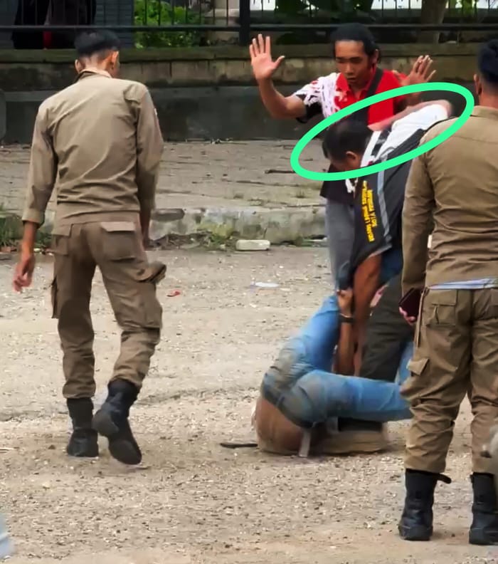 Melihat pria tersebut jatuh, oknum satpol PP langsung melancarkan pukulan dan tendangan bertubi-tubi. Ia juga dibanting oleh oknum Satpol-pp.