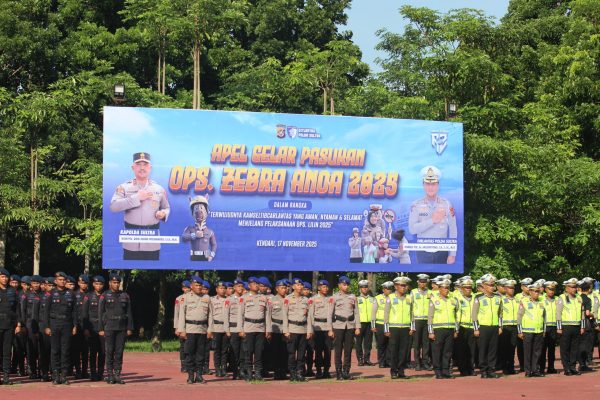 Muarasultra.com, Kendari — Polda Sulawesi Tenggara (Sultra) menggelar Apel Pasukan Operasi Zebra Anoa 2025 di Lapangan Presisi Mapolda Sultra, Senin (17/11/2025). Apel Gelar Pasukan dipimpin Kapolda Sultra Irjen Pol Didik Agung Widjanarko, S.I.K., M.H dan dihadiri Danrem 143/Halu Oleo Brigjen TNI Wahyu Sugiarto, Danlanud Halu Oleo, Danlanal Kendari, Ketua DPRD Sultra, Wakapolda Sultra Brigjen Pol Dr. Gidion Arif Setyawan, S.H., S.I.K., M.Hum, Irwasda Polda Sultra Kombes Pol Hartoyo, S.I.K, serta para Pejabat Utama Polda Sultra, perwakilan Dinas Perhubungan dan Jasa Raharja. Apel juga melibatkan personel gabungan TNI–Polri.