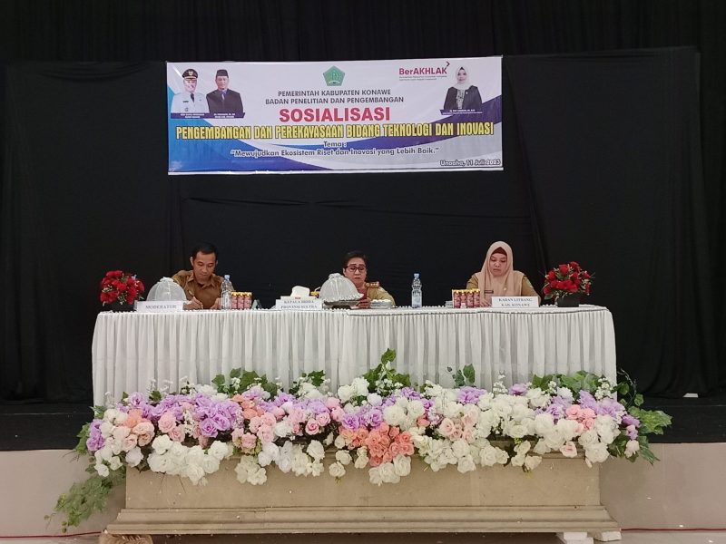 Muarasultra.com, KONAWE – Sebagai upaya mamacu pengembangan teknologi dan inovasi di Kabupaten Konawe, Badan Penelitian dan Pengembangan atau Balitbang Kabupaten Konawe, Sulawesi Tenggara (Sultra) gelar sosialisasi di Hotel Nugraha, Selasa (11/7/2023).