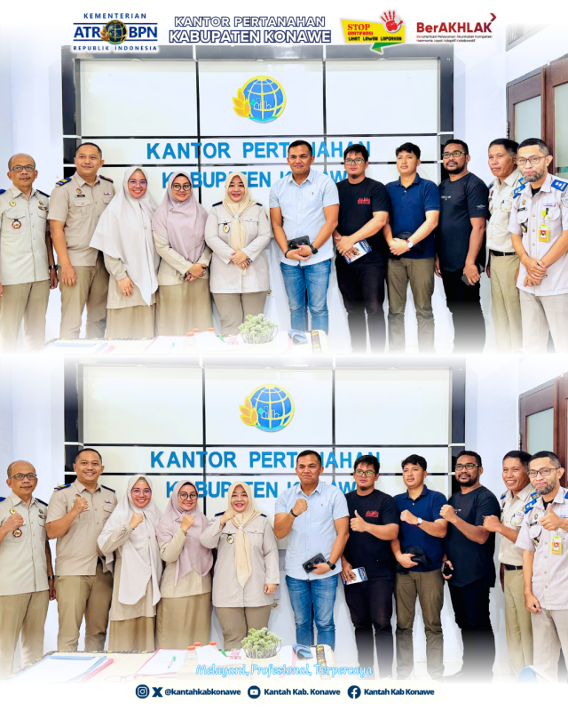Kunjungan ini disambut langsung oleh Kepala Kantor Pertanahan Kabupaten Konawe, Rully Handayani, S.H., M.Kn., bersama jajaran Pejabat Pengawas.