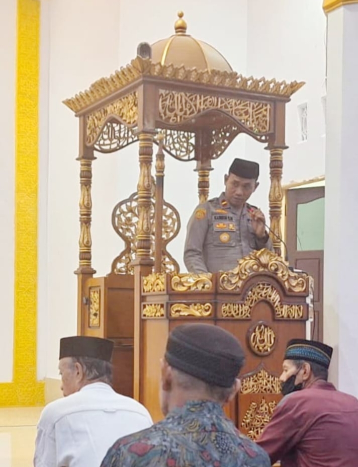 Kapolsek Sampara IPDA Kasibun, SH., saat menyampaikan pesan kamtibmas di Masjid Babul Khairat Desa Rawua, Kecamatan Sampara, Kabupaten Konawe.