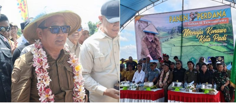Muarasultra.com, KONAWE – Penjabat Bupati Konawe Harmin Ramba (HR) menghadiri acara panen padi perdana di desa Tawamelewe, Kecamatan Uepai, Kabupaten Konawe, Sulawesi Tenggara, Sabtu (20/4/2024).
