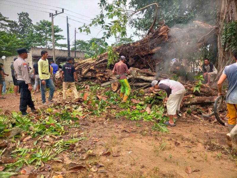 Warga desa Walay bersama Personel polsek Abuki lakukan pembersihan batang pohon beringin tumbang.