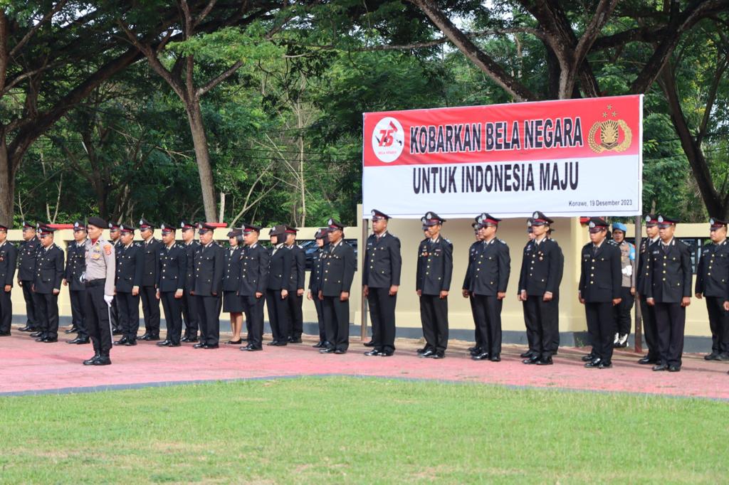 Khususnya Polres Konawe menggelar upacara Hari Bela Negara (HBN) ke 75 Tahun 2023 yang berlangsung di halaman Mako Polres Konawe dengan tema _Kobarkan Bela Negara untuk Indonesia Maju, Selasa (19/12/2023) pukul 08.00 wita.