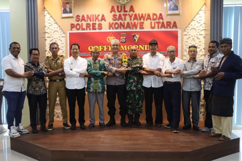 Muarasultra.com, KONAWE UTARA – Kepolisian Resor (Polres) Konawe Utara (Konut) menggelar Coffee Morning bersama Wakil Bupati Konut, Forkopimda, TNI, Tokoh Masyarakat, Tokoh Adat, dan Ketua Paguyuban se-Kabupaten Konut, Senin (26/8/2024).