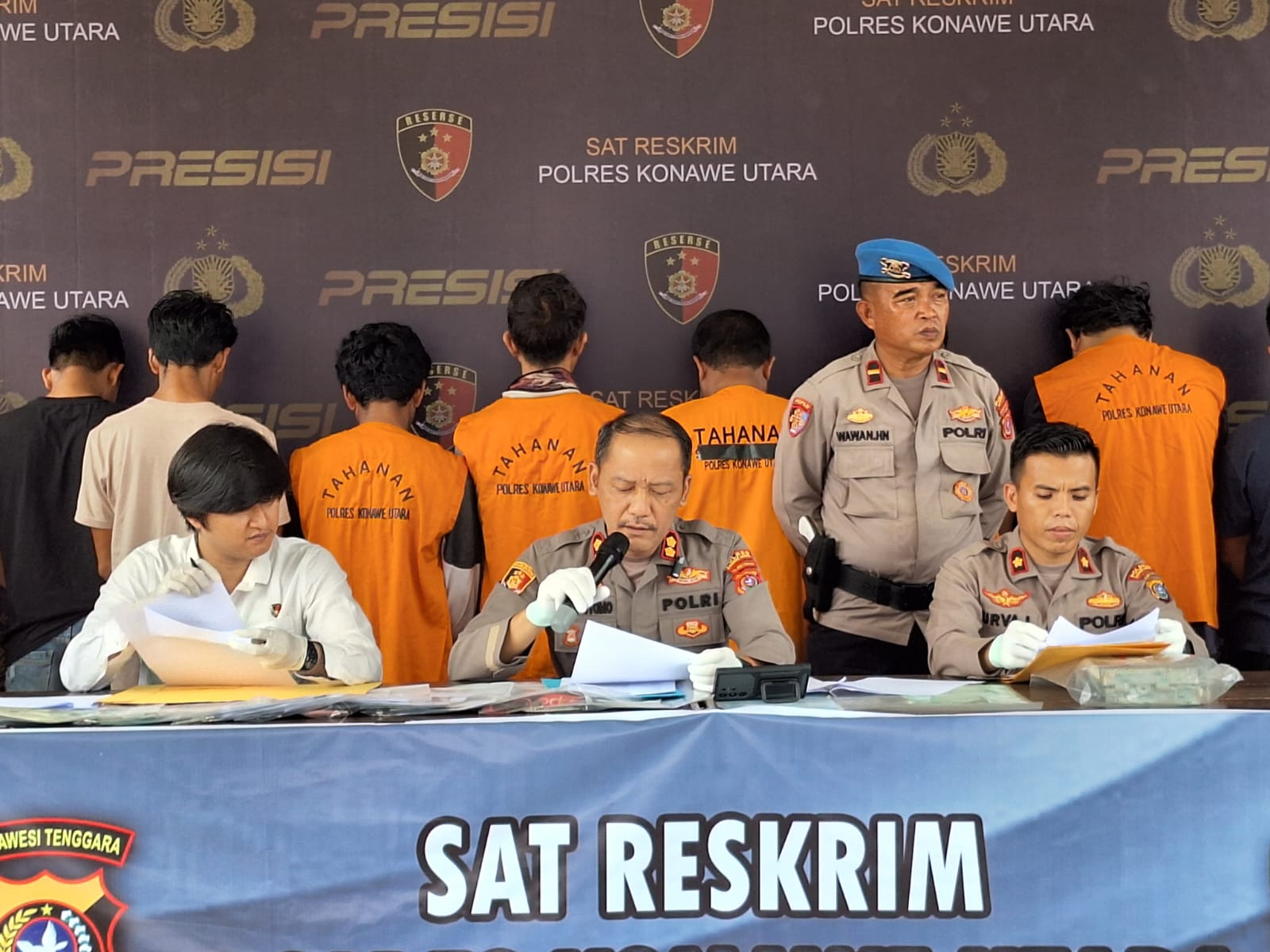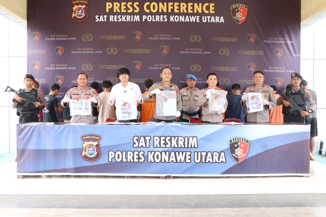 Press release Tindak Pidana tertentu (Tipidter) Sat Reskrim Polres Konawe Utara dipimpin Kapolres AKBP Priyo Utomo, S.H., S.I.K bersama Wakapolres Kompol Urva Lomansyah, S.Si., S.I.K., M.H, Kabag Ops AKP Sunari, S.E.,MM, Kasat Reskrim AKP Bhekti Indra Kurniawan, S.T.K.,S.I.K dan Kasiwas Ipda Wayan Suparta bertempat di teras Mako Polres Konawe Utara Kelurahan Wanggudu Kecamatan Asera Kabupaten Konawe Utara.