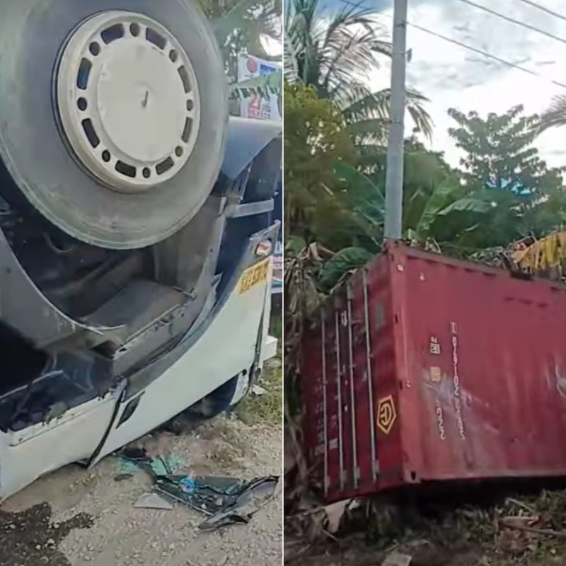 Saat melintas di jalan menikung di Kelurahan Uepai, Mobil Izuzu giga DT 8321 KE terguling. Kemudian kontenernya terjatuh dan menghantam tiang listrik.