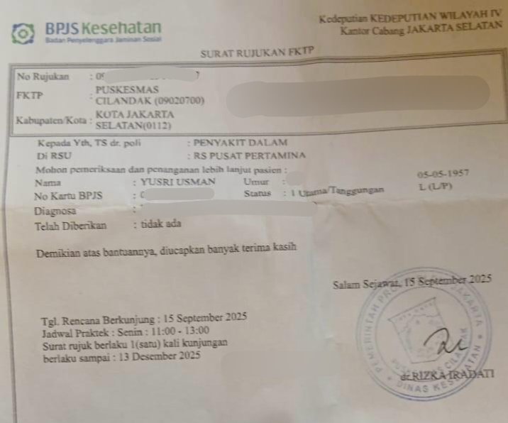 “Saya saat ini sedang sakit, sesak nafas. Dari Puskesmas Cilandak saya dirujuk ke Rumah Sakit Pusat Pertamina pada 15 September 2025 oleh dr Rizka Iradati. Saya mengalami gejala sesak nafas dan rasa sakit pada jantung saya. Saat saya mendaftarkan rujukan itu melalui aplikasi BPJS Kesehatan, malah disebutkan untuk sepekan ini kuota pasien penuh. Saya coba cari jadwal untuk pekan selanjutnya, malah disebutkan tidak ada jadwal dokter yang bisa melayani. Ini bagaimana kok bisa begini?,” tanya Yusri Usman.