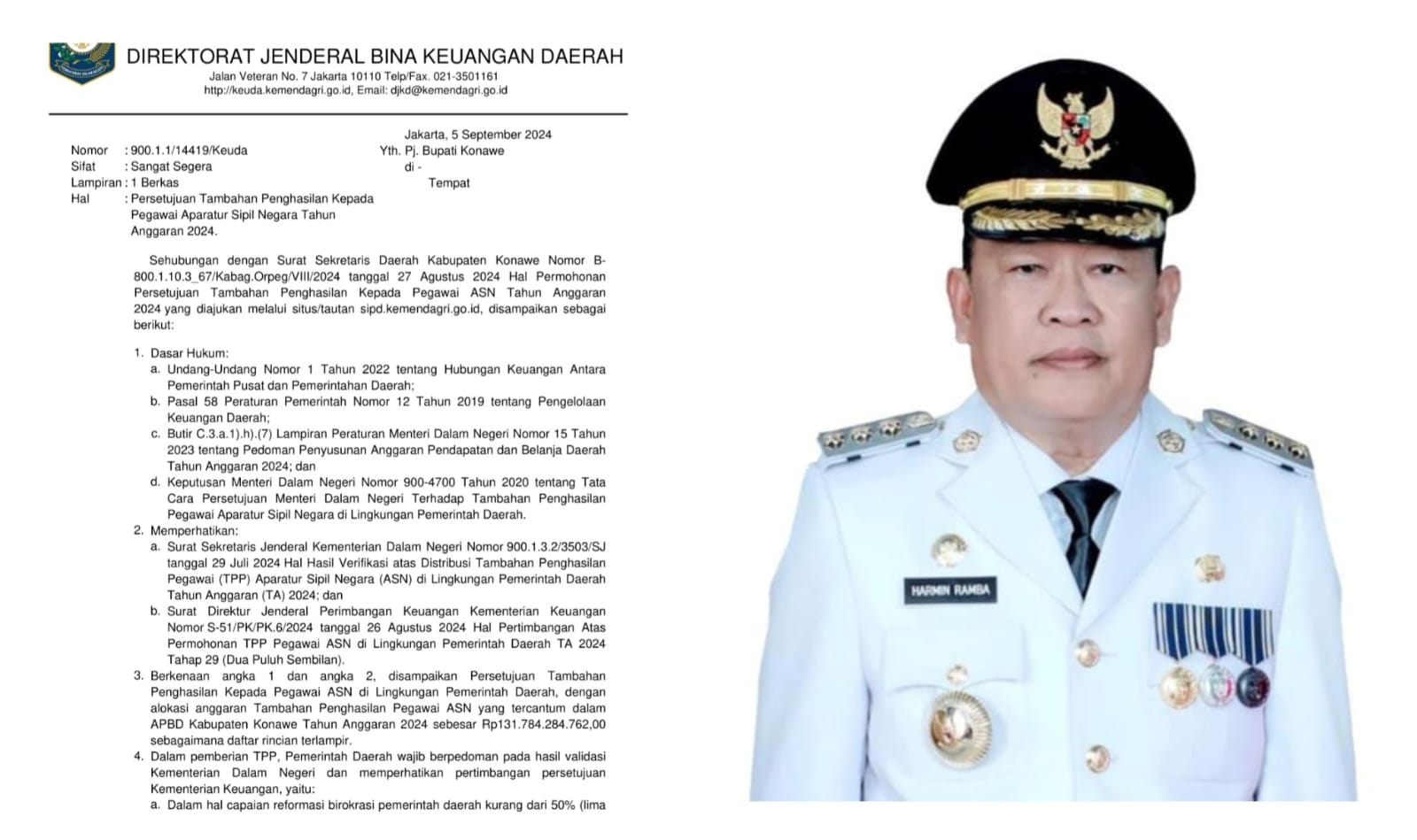Sifat: Sangat Segera, Lampiran : 1 Berkas. Hal: Persetujuan Tambahan Penghasilan Kepada Pegawai Aparatur Sipil Negara Tahun Anggaran 2024,” ujar Dr. Drs. Horas Panjaitan, M.Ec. di Jakarta, 5 September 2024 yang di tujukan kepada Pj Bupati Konawe di tempat.