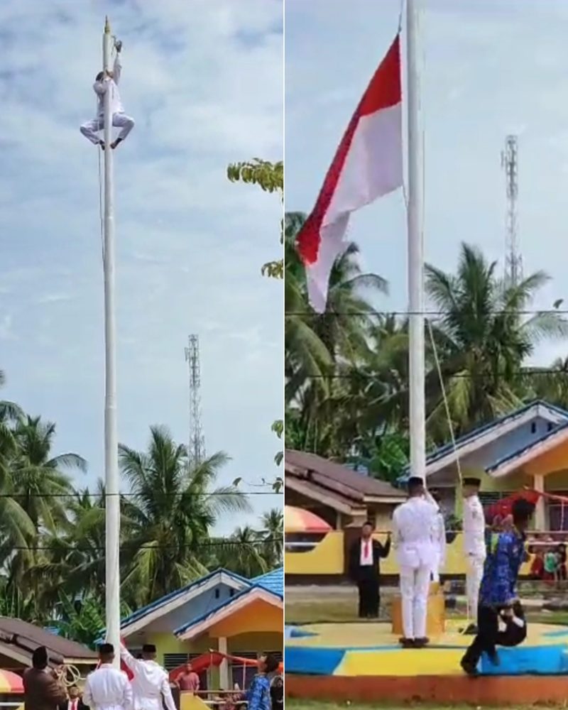 Aksi heroik Riski Lamato SMA Negeri 9 Gorontalo Utara menyelamatkan tali di tiang bendera yang putus ketika upacara HUT ke-78 Republik Indonesia di Kecamatan Sumalata Timur.