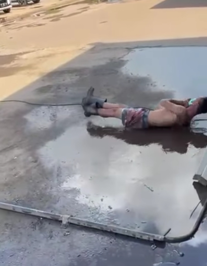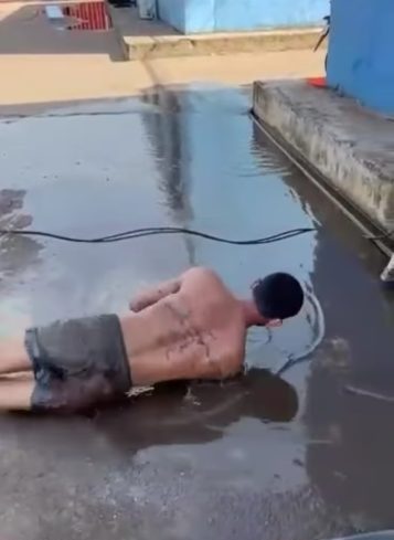 Video berdurasi 30 detik nampak seorang laki-laki menggunakan masker tengah berguling diatas genangan air tanpa menggunakan baju.