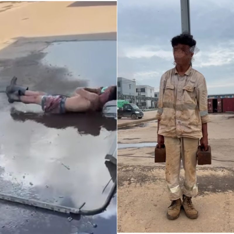 Karyawan malang ini diduga tengah menjalani hukuman yang diberikan oleh oknum petugas keamanan perusahaan atau security.