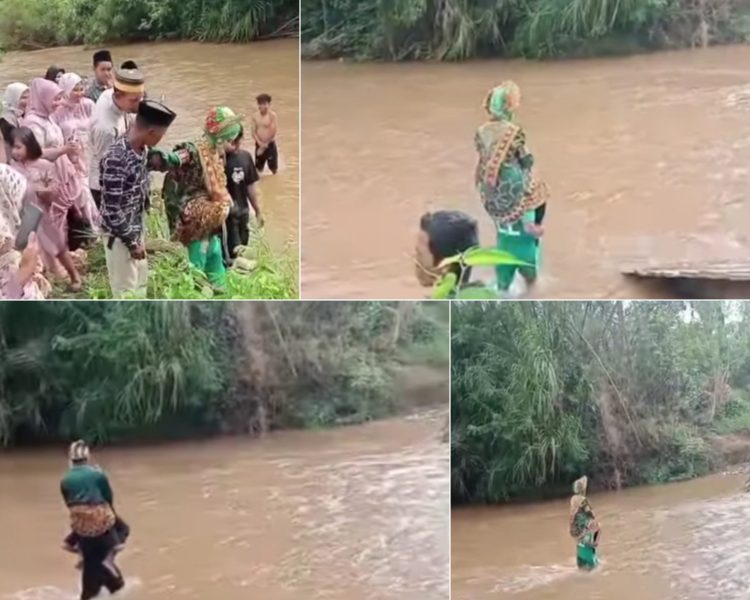 Sepasang pengantin baru nekat melewati sebuah sungai dengan cara digendong karena jembatan yang biasa digunakan oleh warga hanyut terbawa arus sungai.